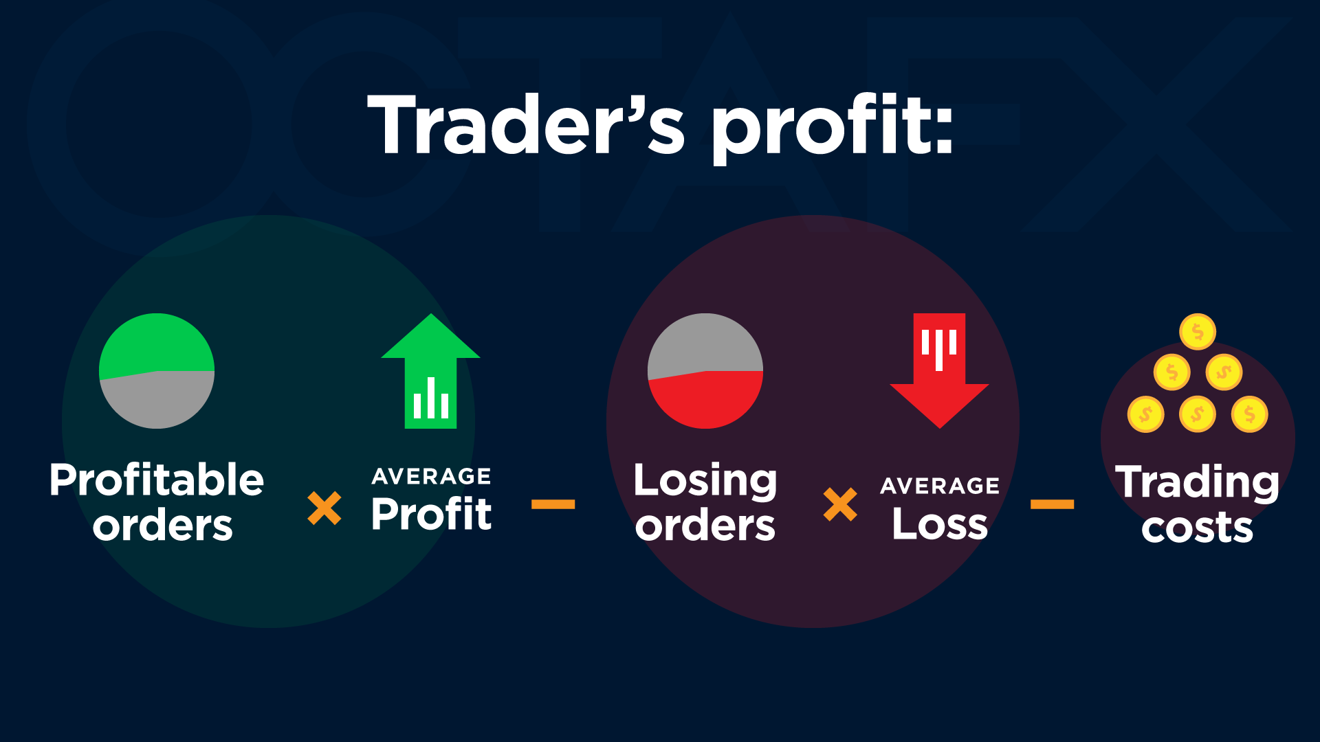 Trader’s profit = % of your profitable orders × your average profit – % of your losing orders × your average loss – trading costs