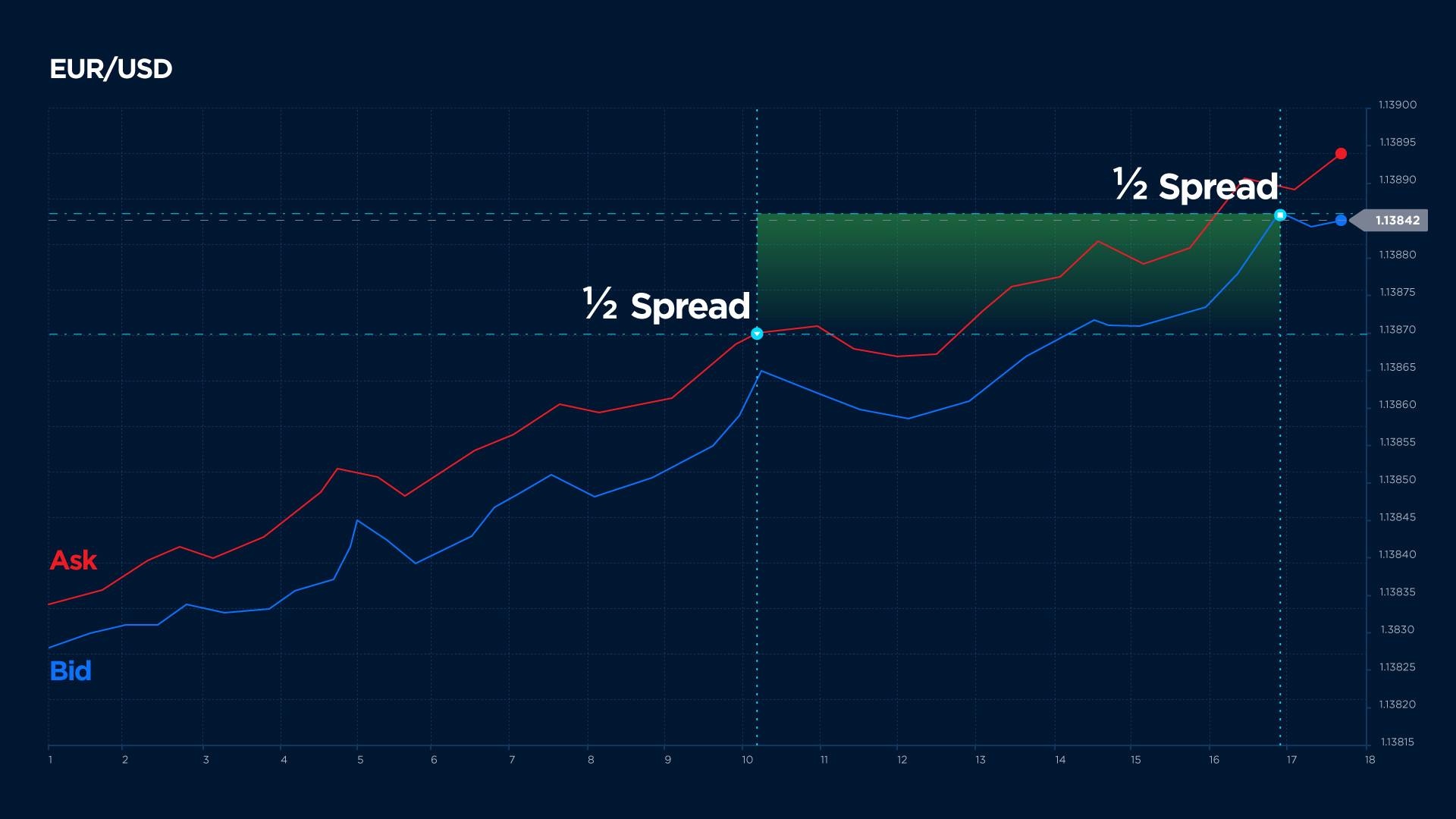 Spread usually amounts from 1 to 2 pips or from 0.0001 to 0.0002 of the base currency.