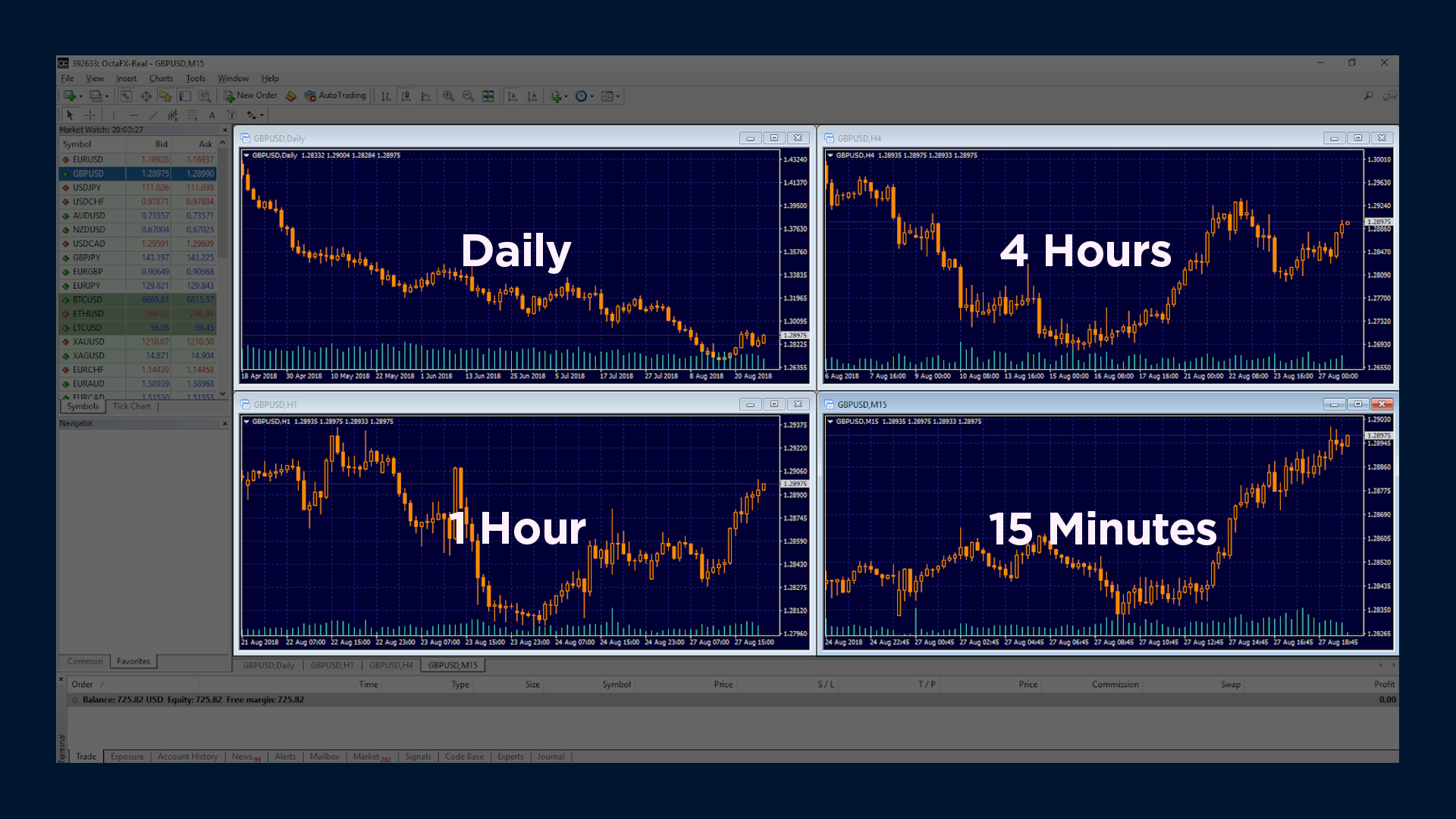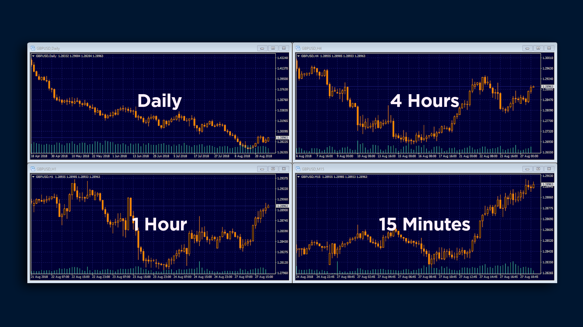 Traders use monthly, weekly, daily, 4-hour, hourly, 15-minute, and even 1-minute timeframes.