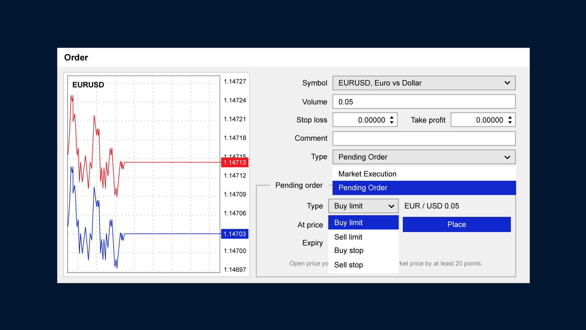 You can also create pending orders. These open automatically when the price hits the level you specified. These orders are called ‘Limit Order’ and ‘Stop Order’.